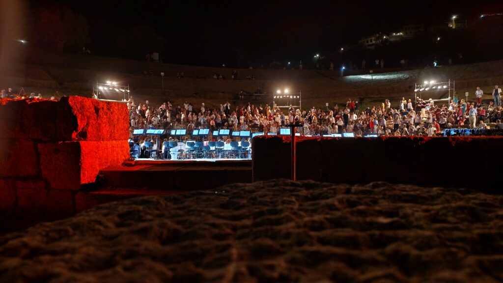 Το δροσερό βράδι, η σελήνη που ανέτειλε στη β’ πράξη του έργου πίσω από τον ορεινό όγκο της Εύας, η στοά του “Κρεοπωλείου” φωτισμένη να λειτουργεί ως άλλο αυθεντικό Ρωμαϊκό σκηνικό σε δεύτερο φόντο και σε δεύτερο – παρελθόντα- χρόνο συντέλεσαν για να αισθανθεί το πολυπληθές κοινό πόσο αναγκαίο είναι να βιώνει στιγμές σαν αυτές. Στιγμές που η φύση και τα δημιουργήματα του ανθρώπου είτε αυτά είναι η μουσική η ίδια, είτε τα αρχαία λείψανα του χώρου δένουν τόσο αυθεντικά και αρμονικά που δεν αφήνουν περιθώρια να φανταστείς ότι θα μπορούσε κάτι να είναι καλύτερο από αυτό που ζεις τη στιγμή εκείνη. Όλα ήταν αναγκαίες αποδείξεις. Ακόμα και οι οικογένειες των συμπαθέστατων κατά τα άλλα βατράχων που αποφάσισαν να δώσουν δυναμικό παρών με κοασμούς που στην αρχή μας έκαναν να μειδιάσουμε (ή και να εκνευρίσουν κάποιους) αλλά στο τέλος να τους αποδεχτούμε ως μέρος του όλου και να μην μπορούμε να σκεφτούμε μια επόμενη παράσταση δίχως αυτούς, ή να παραδεχτούμε τελικά πως η φύση έχει γούστο…